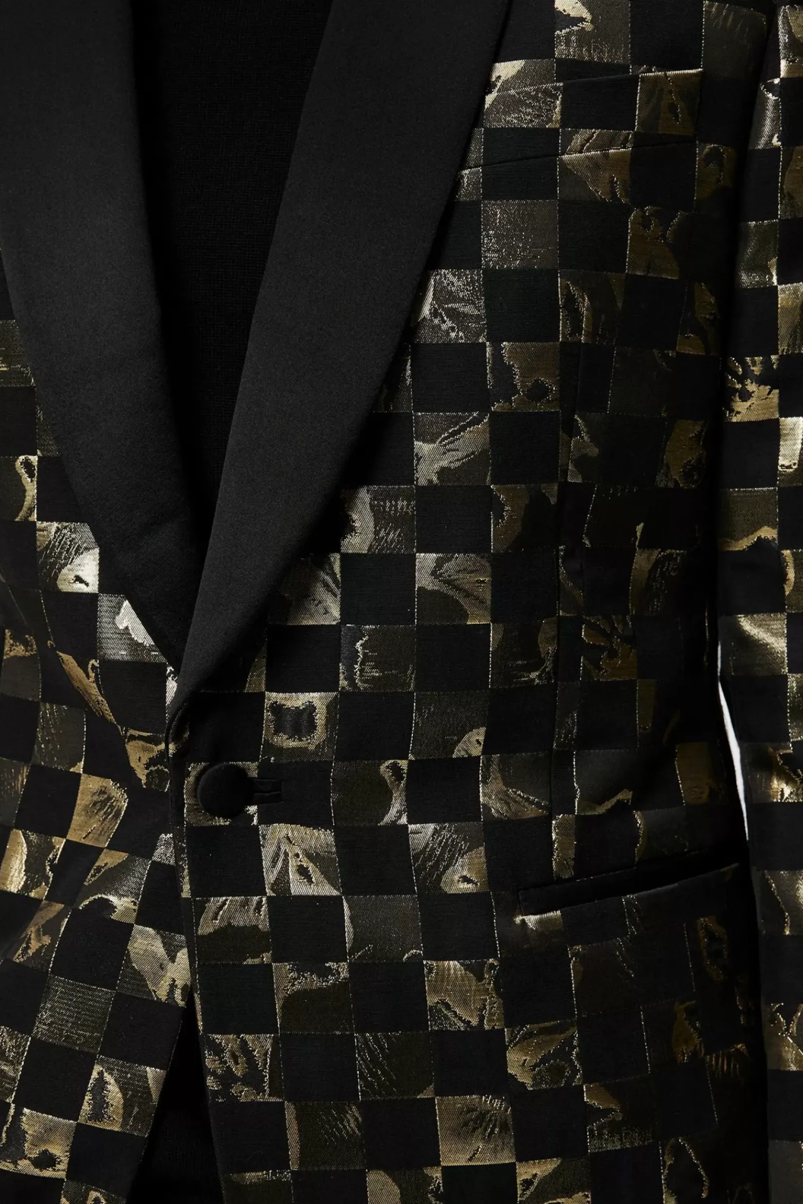 Vår Oppsiktsvekkende Lenny S Iris Checker Blazer Laget I Et Eksklusivt Jacquard, Gull Og Svart, Metallisk, Rutete Design Vevd I Frankrike. Skreddersydd Med En Myk Silkeblandet Sjalkrage I Enkeltspent Snitt, Med Svarte Satengdekkede Knapper Og Lommedetaljer I Silkesateng. Bruk Den Med Vår Lyd Merino Turtleneck Sweater Og Haij Double Pleat Pants.