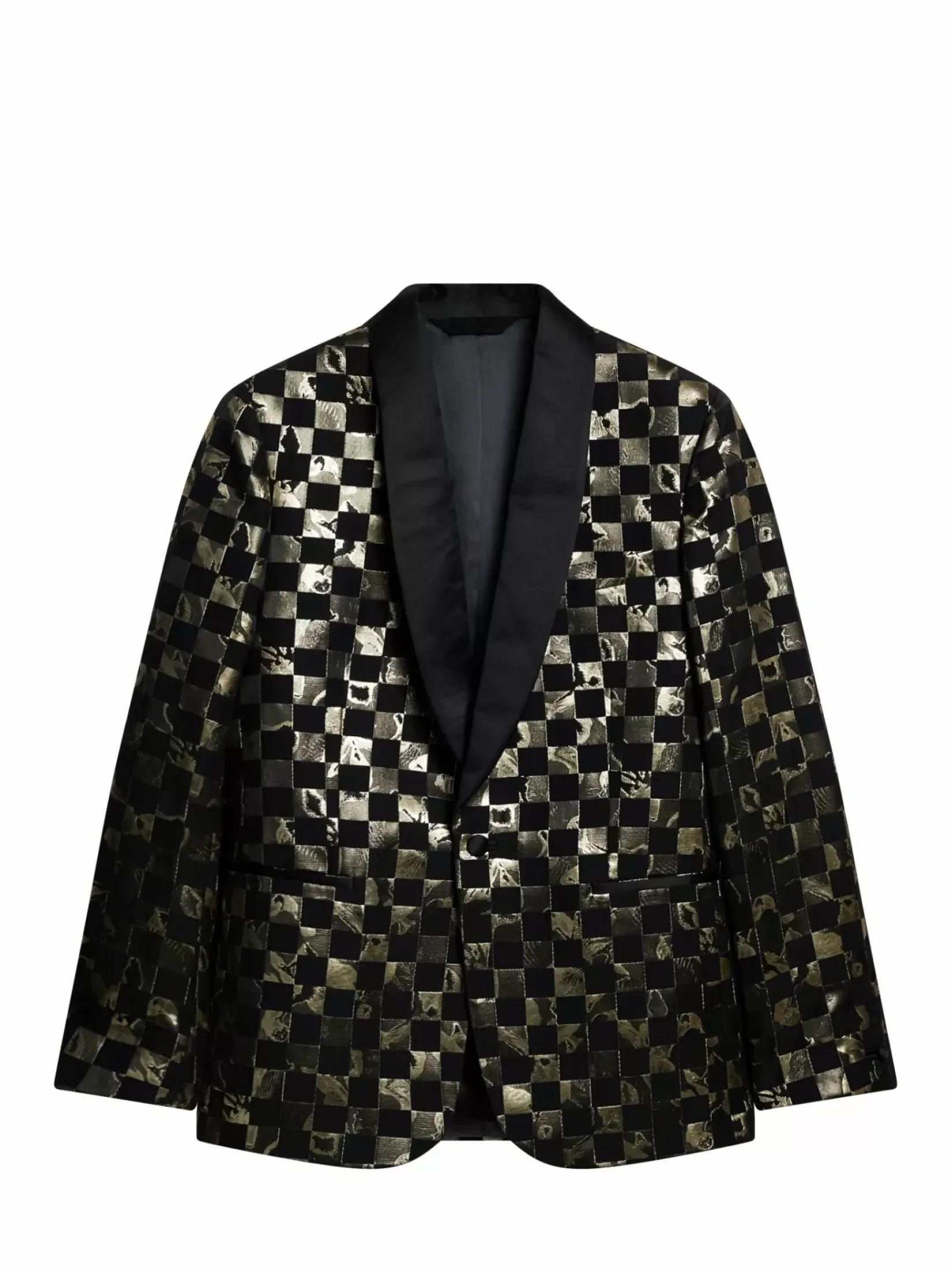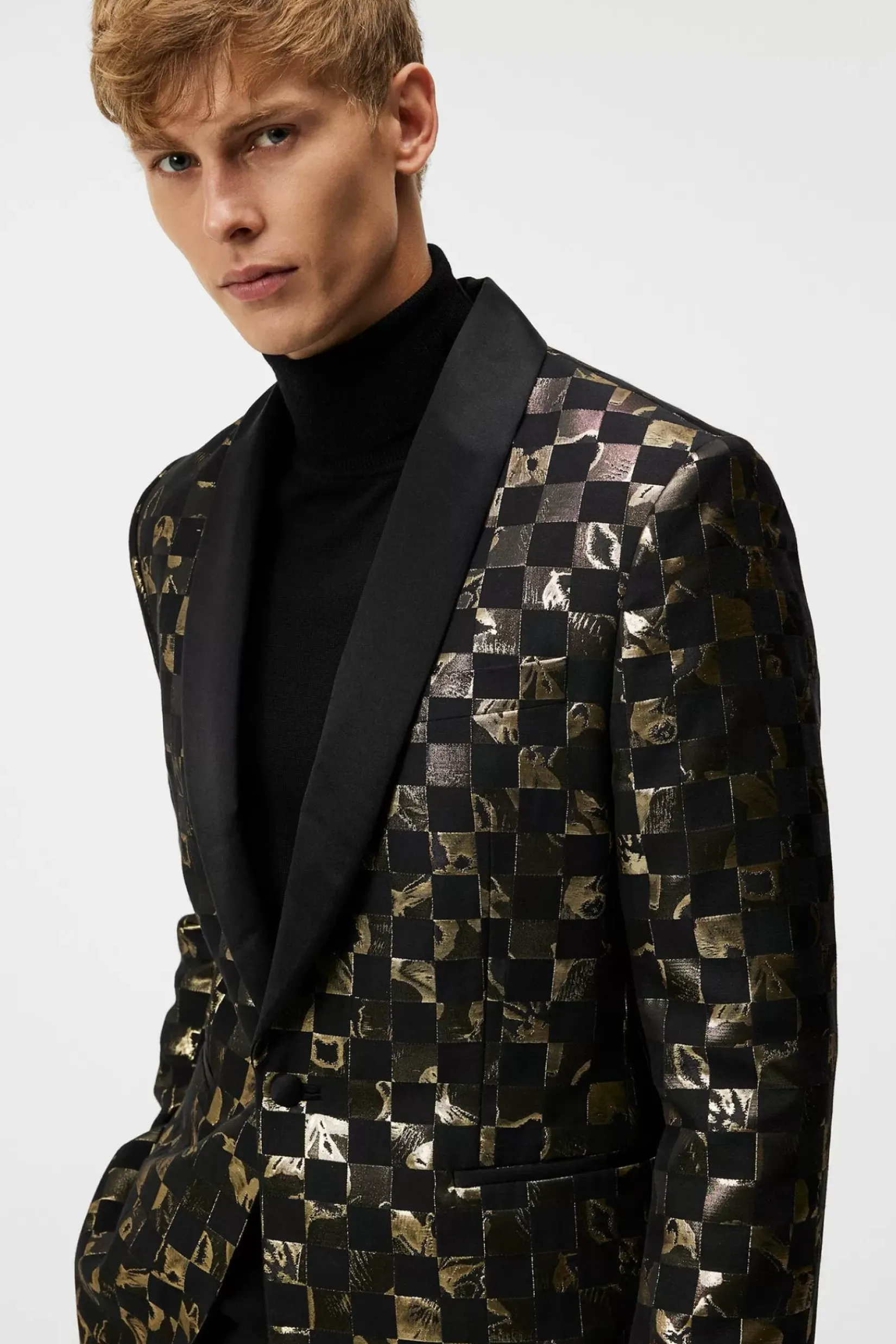 Vår Oppsiktsvekkende Lenny S Iris Checker Blazer Laget I Et Eksklusivt Jacquard, Gull Og Svart, Metallisk, Rutete Design Vevd I Frankrike. Skreddersydd Med En Myk Silkeblandet Sjalkrage I Enkeltspent Snitt, Med Svarte Satengdekkede Knapper Og Lommedetaljer I Silkesateng. Bruk Den Med Vår Lyd Merino Turtleneck Sweater Og Haij Double Pleat Pants.